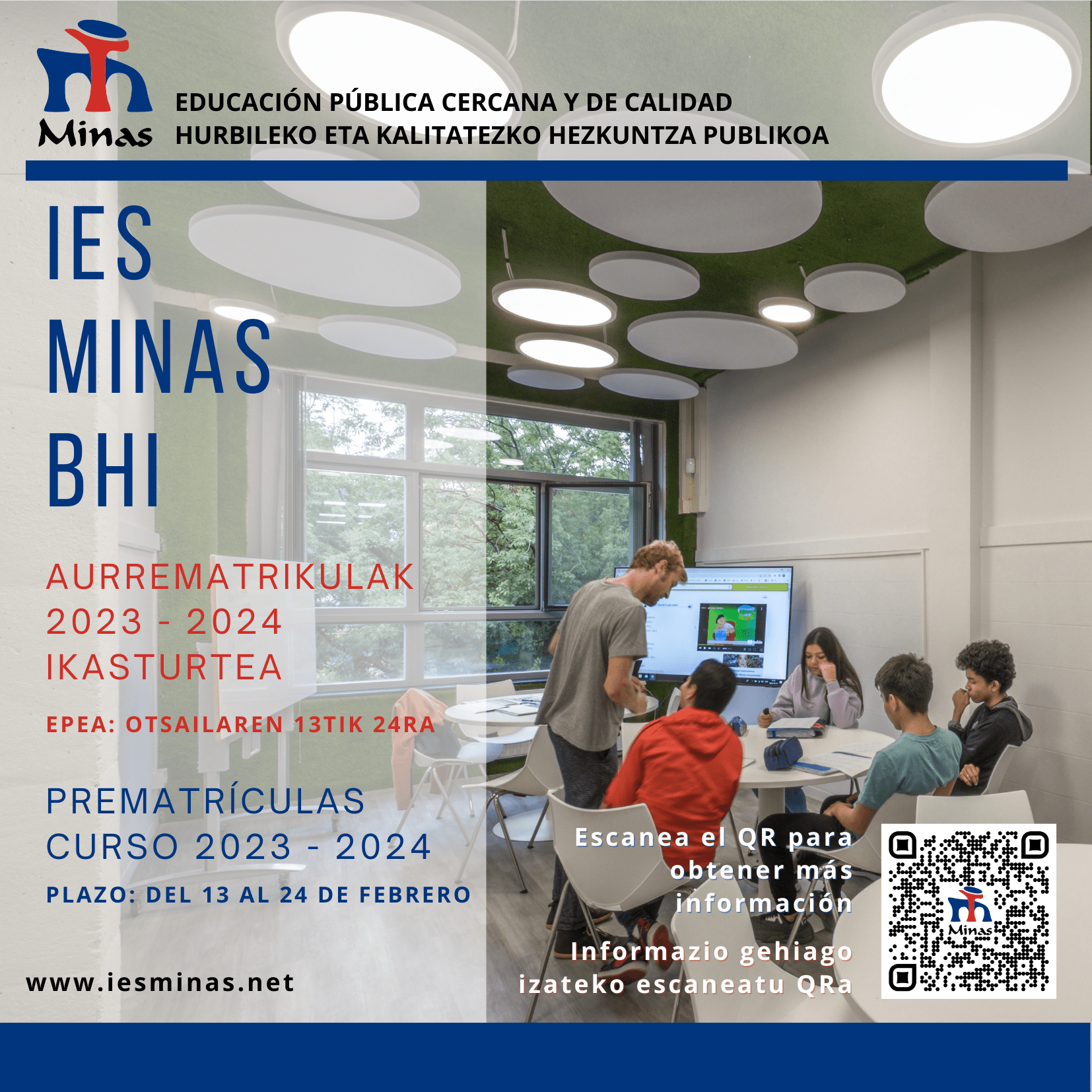 Minas Institutuko irakasleek eta zuzendaritza-taldeak gure ikastetxea ezagutzera gonbidatu nahi ditugu familiak eta etorkizuneko ikasleak, egun hauetan egingo diren ate irekiko jardunaldietan: