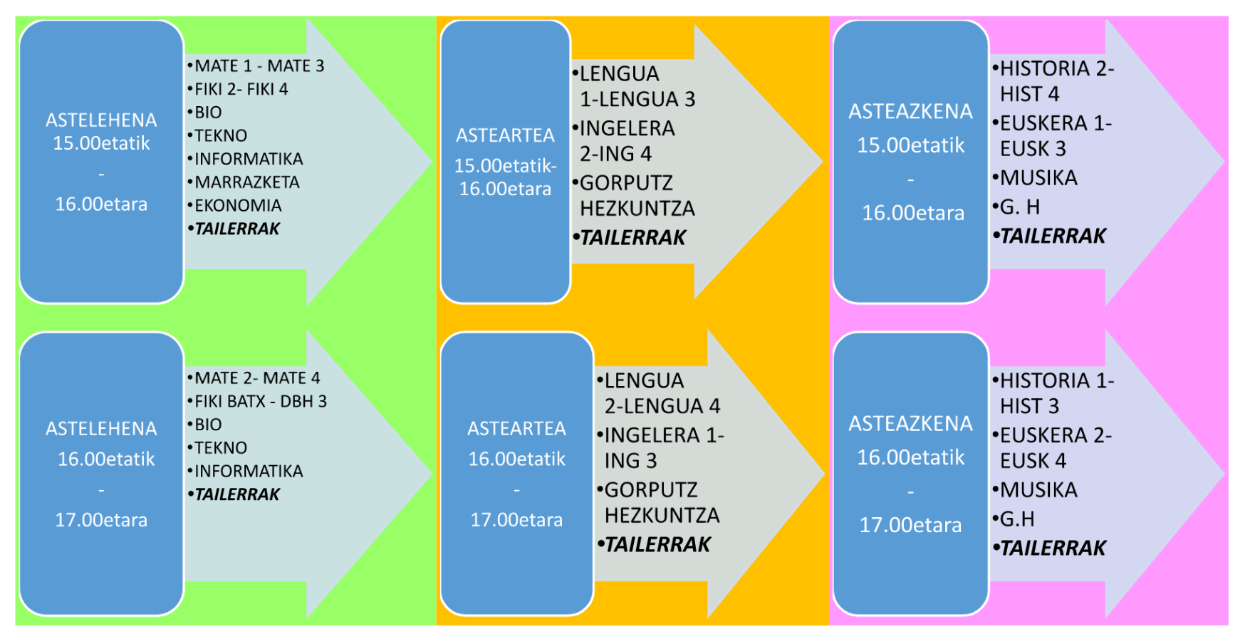 Erantsitako dokumentuetan errefortzu eta tailerren ordutegi zehatzak ikus ditzakezue.