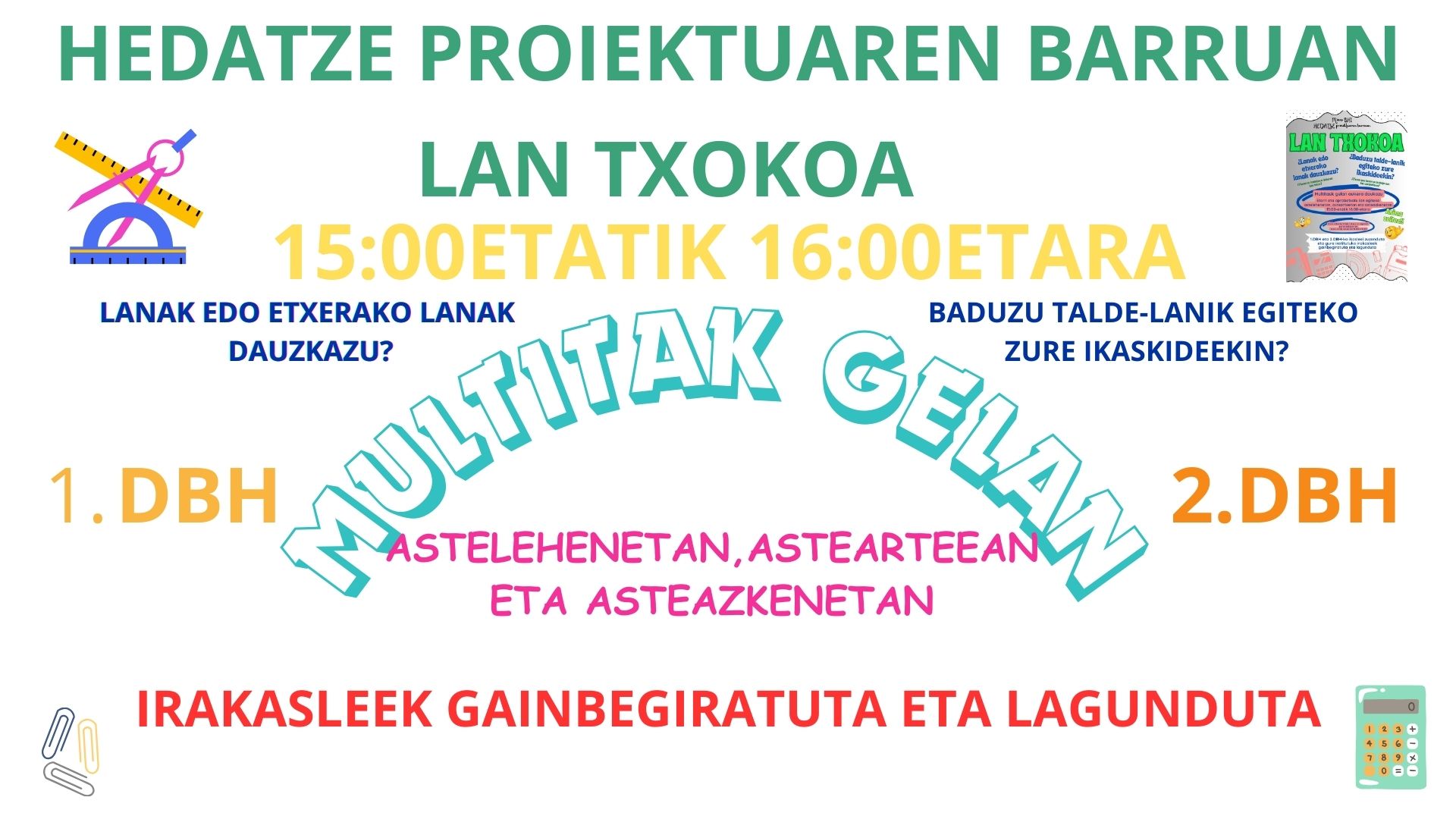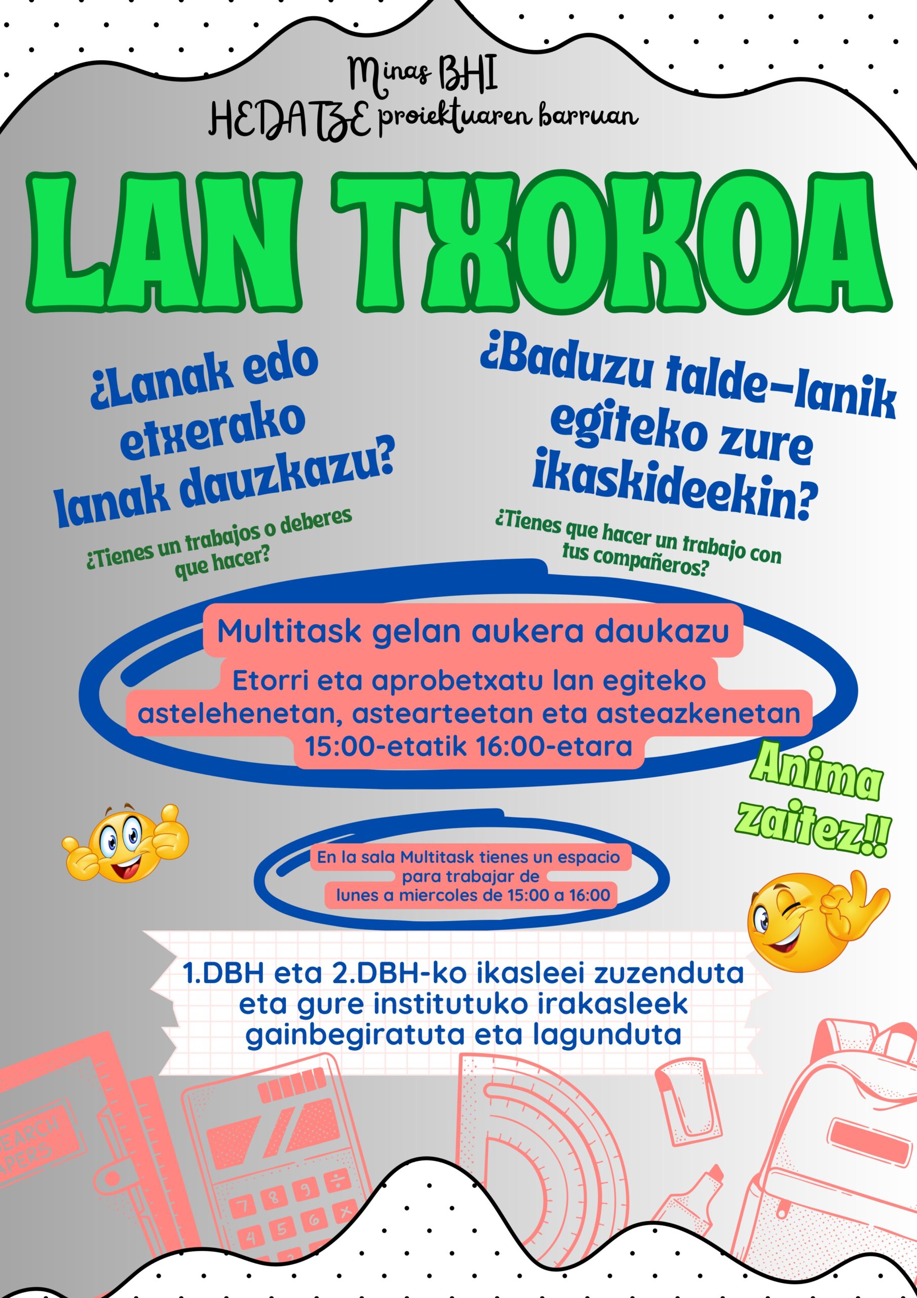 Astelehen, astearte eta asteazkenetan, 15:00etatik 16:00etara, DBHko 1. eta 2. mailako ikasleek etxeko lanak, banakako lanak edo talde-lanak egiteko aukera izango dute.
