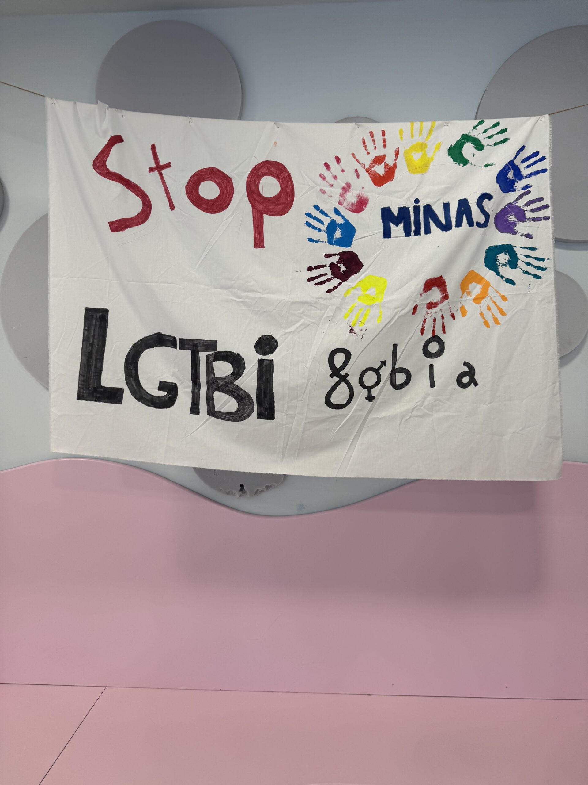 Pankarta handia da, eta elkarlanean egin da. Babes-mezuak eta LGTBIQ+ komunitatearen ikurrak biltzen ditu. Hain leku ikusgarrian jartzeak hezkuntza-komunitate osoa sentsibilizatzea eta institutua guztiontzako gune segurua dela gogoraraztea du helburu.