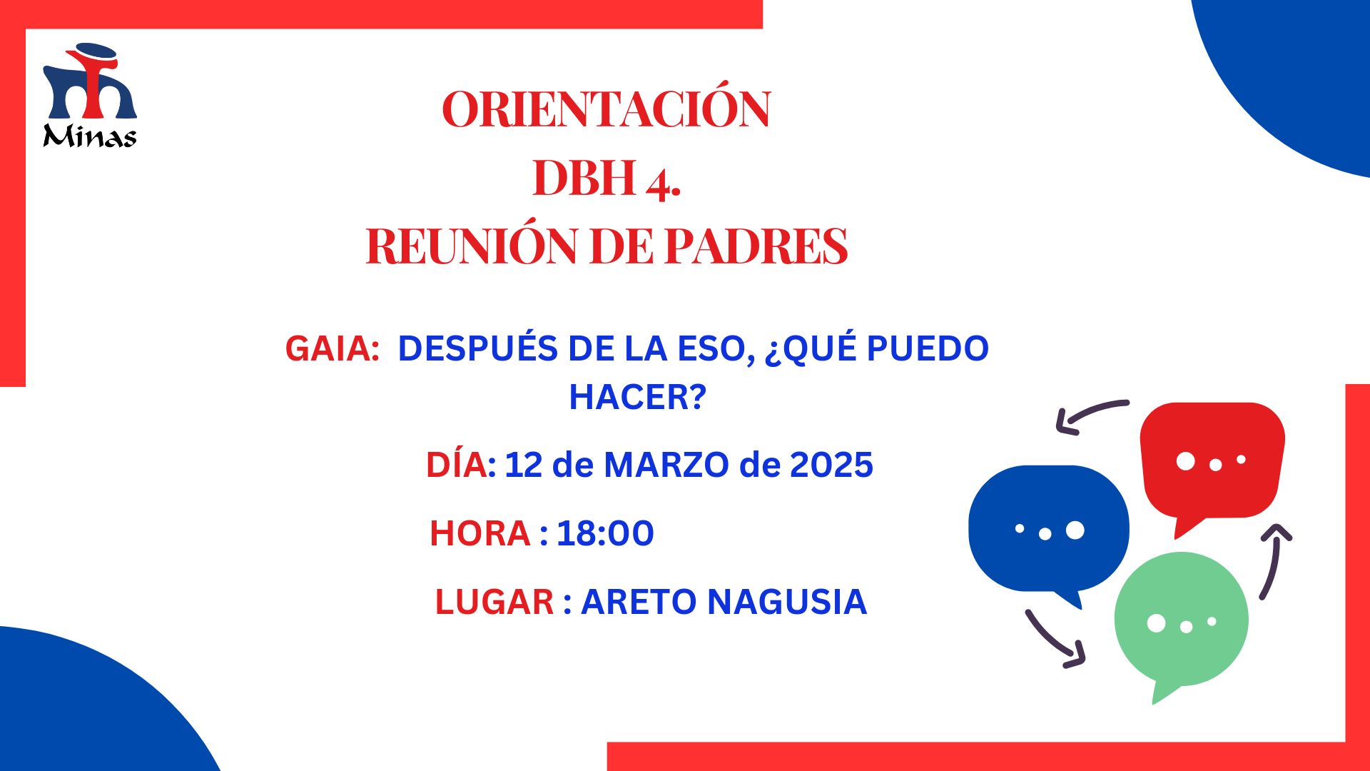 Datorren asteazkenean, martxoak 12, ikastetxeko orientatzailea DBHko 4. mailako ikasleen familiekin bilduko da, ikasturtea amaitutakoan ikasleek izan ditzaketen irteeren berri emateko.